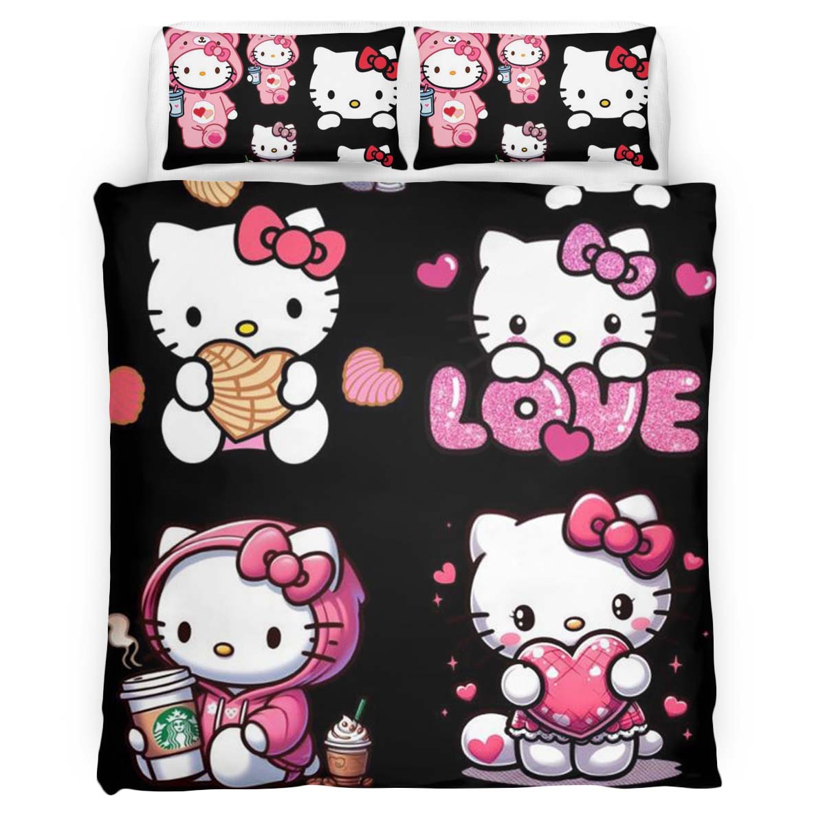 Housse De Couette Hello Kitty fond noir et Kitty rose Parure de lit Ensemble De Literie