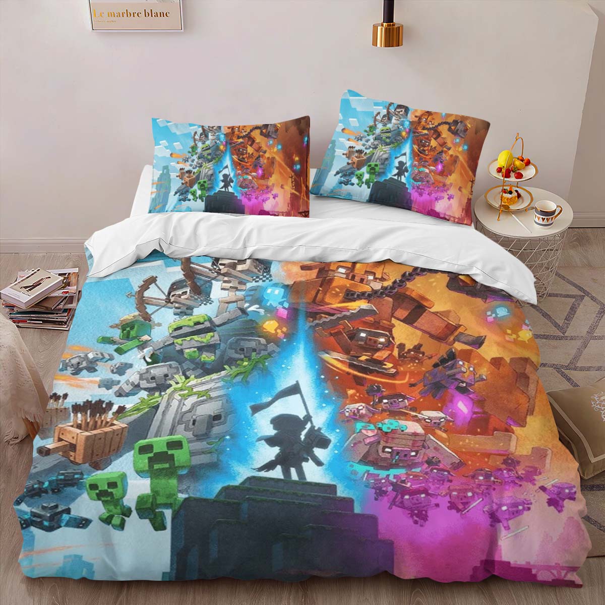 Housse De Couette Minecraft Legends – Creeper, Golem de Savane contre Piglins dans le Nether Parure de lit Ensemble De Literie
