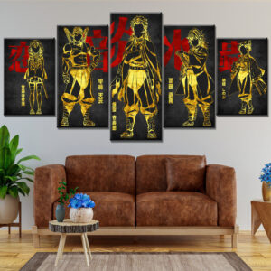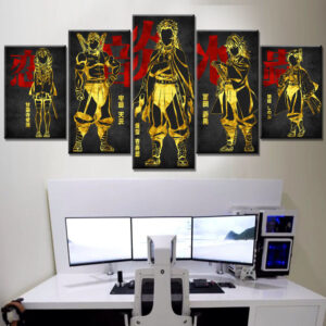 Cette magnifique toile rend hommage aux puissants Piliers de l’anime Kimetsu no Yaiba (Demon Slayer). Avec un design en lignes dorées sur un fond noir mystérieux, cette œuvre d’art dégage une aura de force et de noblesse. Les personnages tels que Rengoku Kyojuro, Tomioka Giyuu, Uzui Tengen, Kocho Shinobu et Kanroji Mitsuri apparaissent avec une posture déterminée, prêts à combattre. Les caractères rouges frappants symbolisent la puissance et la détermination des pourfendeurs de démons. Un cadeau parfait pour les fans d’anime, ajoutant une touche artistique impressionnante à votre espace.