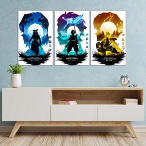 Ce triptyque en toile met en valeur trois personnages emblématiques de Kimetsu no Yaiba : Tanjiro, Zenitsu et Inosuke. Avec des couleurs vibrantes et des effets lumineux saisissants, chaque tableau reflète la puissance et le style de combat unique de chaque personnage. Un choix parfait pour décorer votre espace et afficher votre passion pour Demon Slayer.